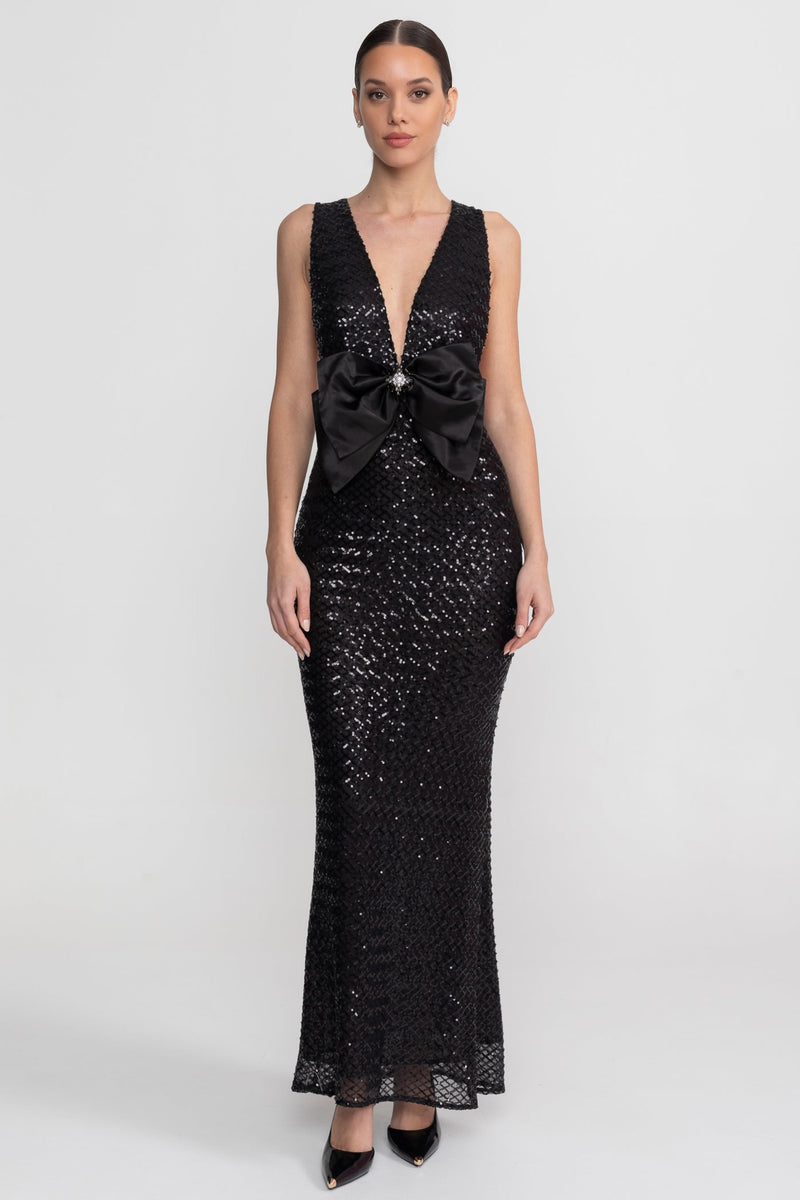 Black Sequin Maxi Dress With Satin Bow Detail