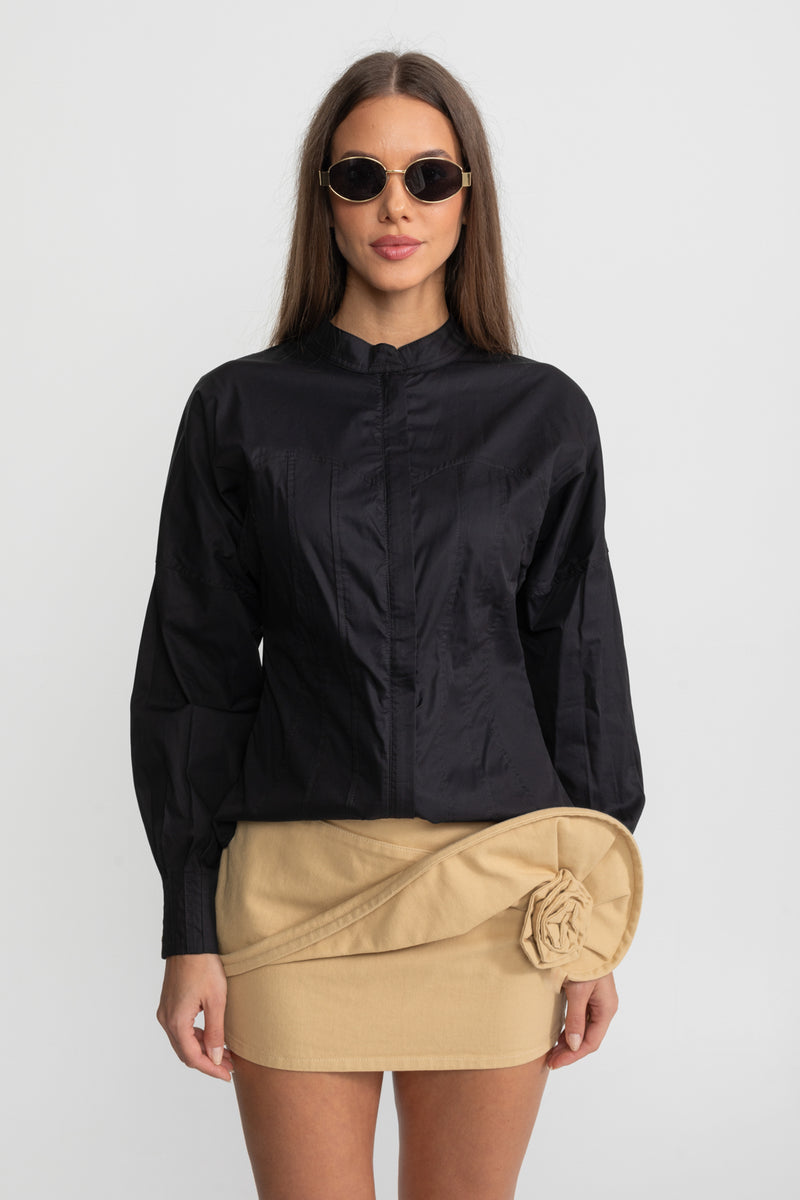 Structured Cotton Poplin Shirt With Corset Stitch Detailing – Black