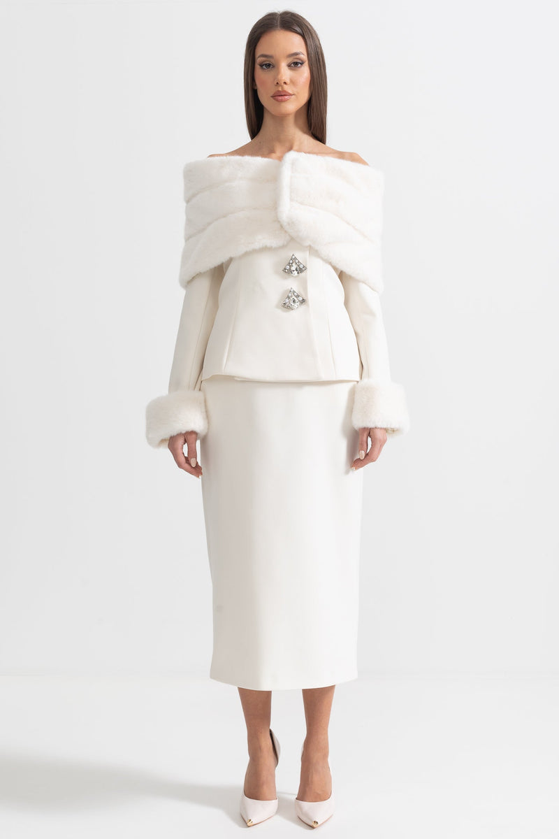 Two-Piece Ensemble With Faux Fur Shawl, Cuffs And Midi Skirt - White