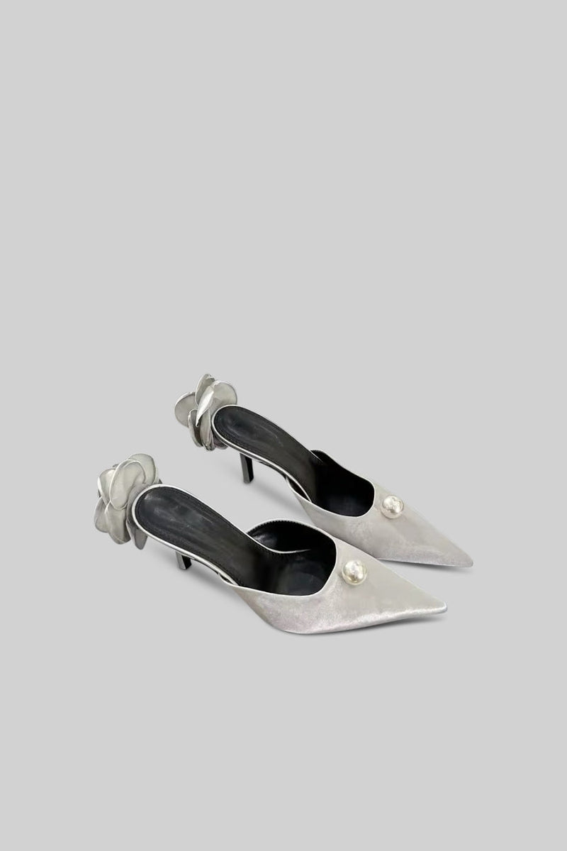 صنادل ساتان فضية بتفاصيل لؤلؤ وزهور
