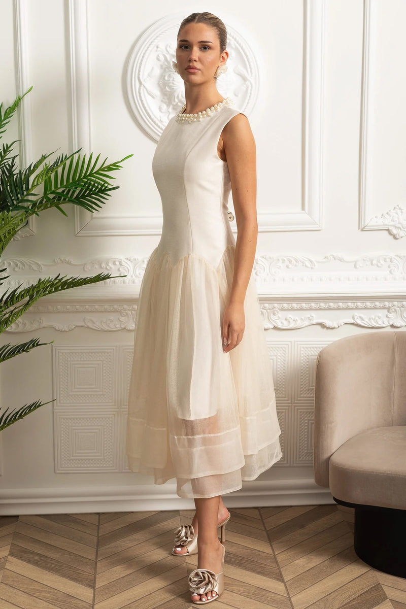 فستان ميدي بدون أكمام بلون Ivoire مع تنورة تول وتفصيل طوق مزين باللؤلؤ